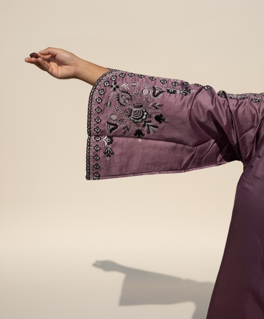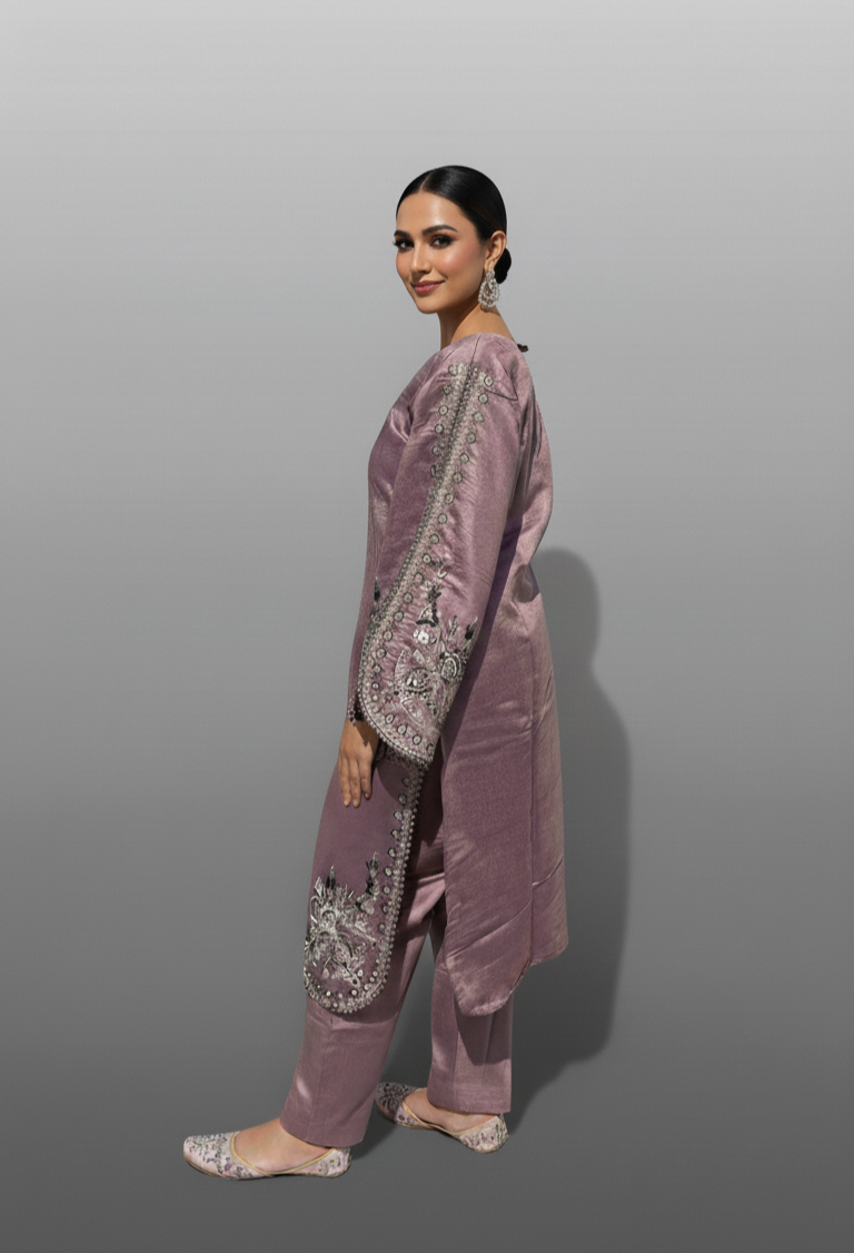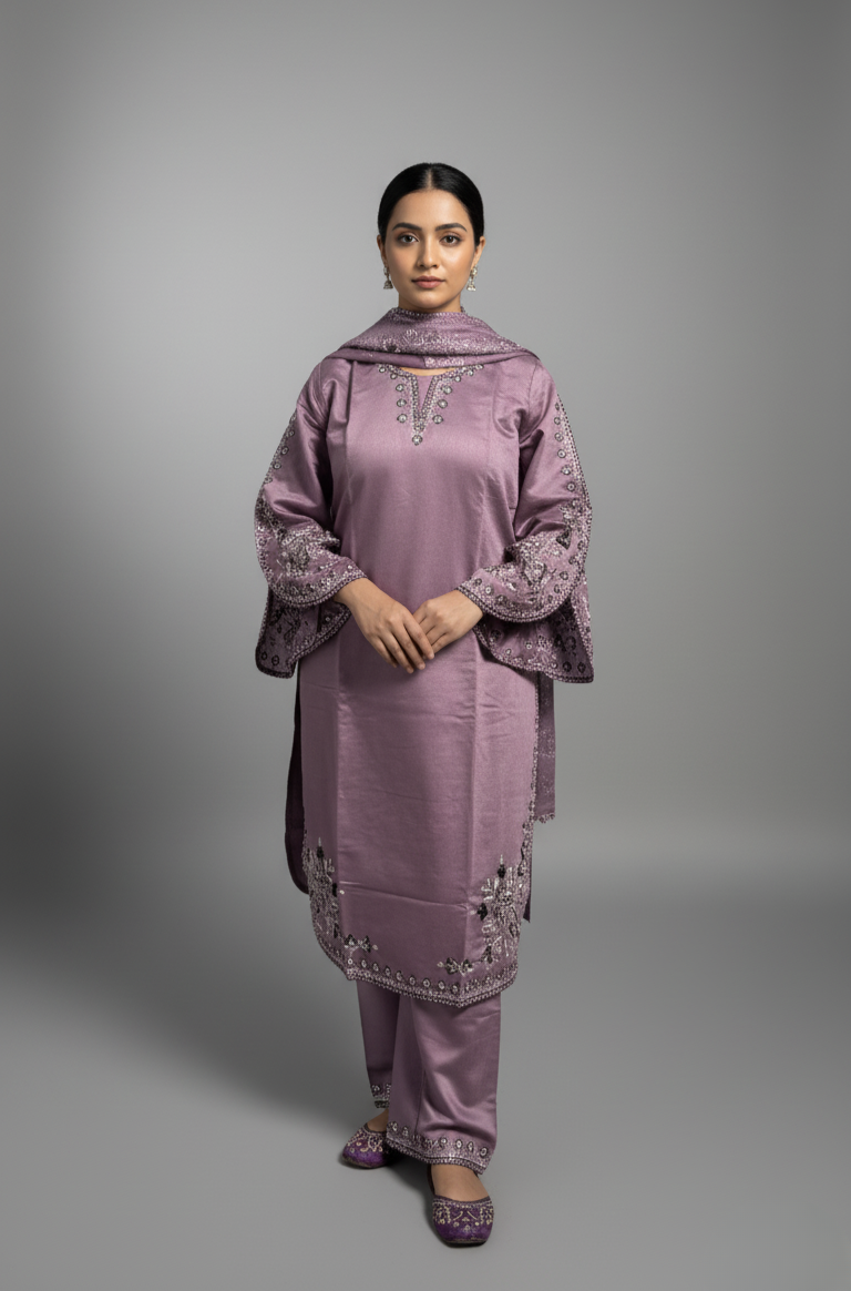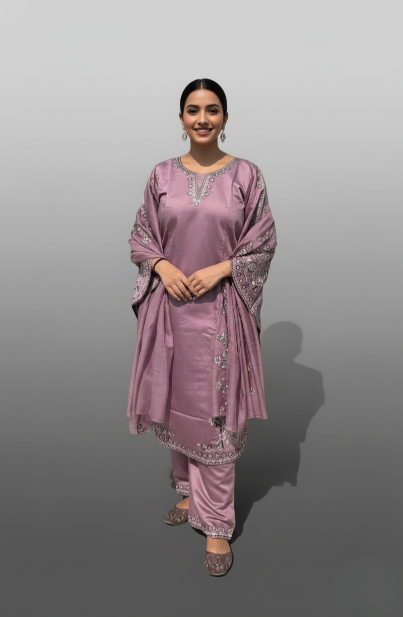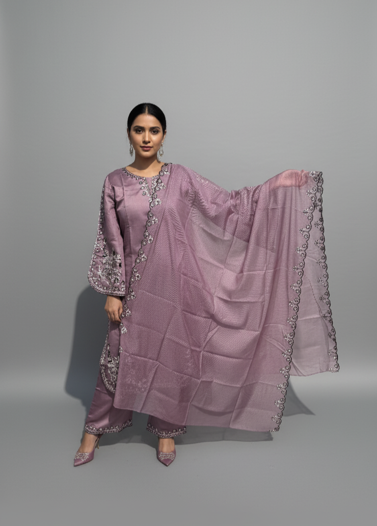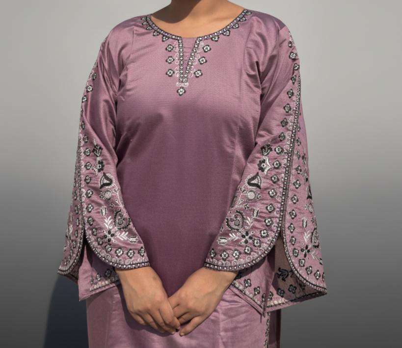 Description: Embrace timeless elegance with this stunning purple kurta set. Crafted from a  Roman silk fabric, this ensemble features intricate black and white threadwork embroidery with sparkling embellishments on the neckline, sleeves, and hem. The wide, statement sleeves add a touch of modern flair to the traditional silhouette. Perfect for festive gatherings and special occasions, this set promises a look of sophisticated grace.